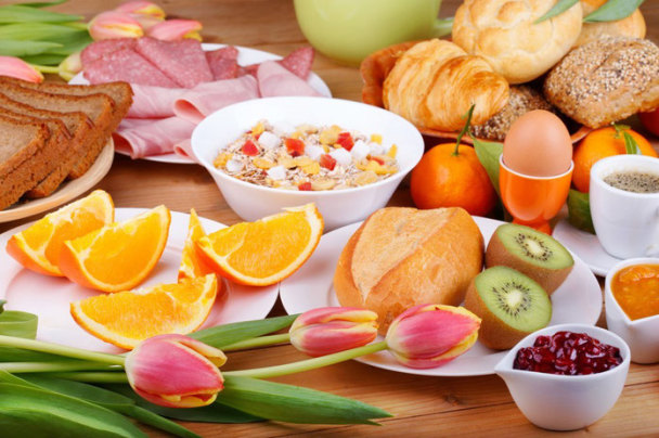 Hierzu wird ein Frühstücksbuffet mit Auswahl von Brot, Brötchen, frischem Hefezopf, Wurst-, Schinken- und Käsevariationen, Tomate und Mozarella, hausgemachter Marmelade, Honig, Butter, verschiedenen Joghurts, selbstgemachtem Birchermüsli, Cornflakes und frischem Obst aufgebaut.